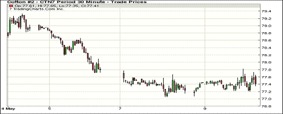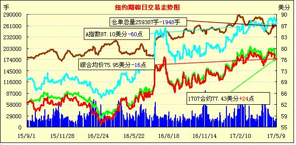 周二紐約期棉近漲遠(yuǎn)跌,1707合約收于77.43美分/磅,漲24點;1710合約收于74.35美分/磅,跌44點。當(dāng)日1707合約開盤受支撐穩(wěn)定上漲,午后升至77.82美分高點,隨后難以突破78美分阻力折返回落,待買盤重新積蓄力量,推收于77.43美分。USDA5月全球供需預(yù)測將在美國東部時間周三12:00發(fā)布。有分析表示,美棉產(chǎn)量預(yù)期或?qū)⑦M(jìn)一步增加,而16/17年度美棉出口數(shù)據(jù)或?qū)⒃鲋?0萬包左右。此外,近期德州西部降水充沛將有效補給棉田灌溉。