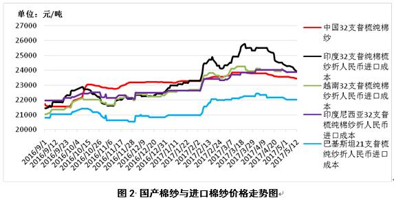 4月28日-5月4日,美棉簽約量達(dá)7.04萬噸,創(chuàng)三周新高,美國農(nóng)業(yè)部發(fā)布的5月份全球產(chǎn)需預(yù)測顯示,2017/18年度全球棉花消費(fèi)量仍高于產(chǎn)量,庫存消費(fèi)比為75%;截至4月底,2016/17年度澳棉的簽約量已占預(yù)計產(chǎn)量的80%以上,印度新棉上市量累計達(dá)到500萬噸,占預(yù)期產(chǎn)量的86.37%,但印度棉花出口遭遇阻力和國內(nèi)需求增長乏力導(dǎo)致印度棉花價格持續(xù)小幅下跌,同時,印度紗價格持續(xù)下調(diào),但仍高于越南同支數(shù)紗。