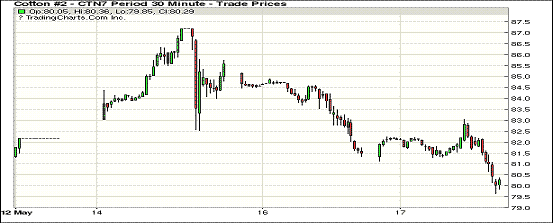 周三紐約期棉漲跌互現(xiàn);1707合約收于80.17美分/磅,跌115點;1712合約收于74.46美分/磅,漲12點。開盤后,主力合約1707受支撐呈上升走勢,一路至83.04美分高點,隨后遭遇阻力及拋盤打壓至79.63美分最低,終收于交投區(qū)間低位。1712合約窄幅調(diào)整,收于79點交投區(qū)間中部。當日美指下跌,大部分大宗谷物商品價格上漲,而舊作棉花未能借力,新老棉走勢背離。