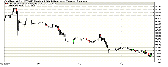 周四紐約期棉繼續(xù)承壓下行;1707合約收于79.24美分/磅,跌93點(diǎn);1712合約收于73.64美分/磅,跌82點(diǎn)。開盤后1707小幅攀升,午間受賣盤打壓,一路拖至179點(diǎn)交投區(qū)間底部,收于79.24美分;1712同樣是支撐乏力,收跌于73.64美分。至5月11日當(dāng)周,16/17年度美棉凈簽約出口量12.72萬包,較前一周16.39萬包縮減3.67萬包;裝運(yùn)量相對(duì)堅(jiān)挺,維持在39.93萬包,較前一周42.84萬包略減2.91萬包。為達(dá)出口預(yù)期,未來11周美棉出口周裝運(yùn)量應(yīng)在27.18萬包左右。