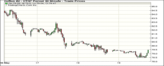 5月19日紐約期棉市場漲跌不一,1707月合約79.45美分/磅,漲21點,1712月合約74.35美分,跌19點。當(dāng)日市場整日交易相對平淡,7月合約穩(wěn)定開盤后小幅走高,盤中遭遇賣盤打壓跌破79美分,交易后期小有反彈,以微幅上漲收盤。7月合約持倉量持續(xù)減少,12月合約持倉已經(jīng)反超成為主力合約。據(jù)CFTC報告,截止5月12日,7月合約買方共點價4960手。