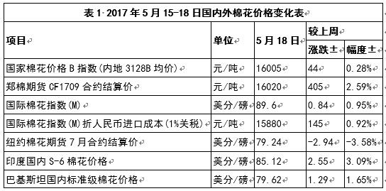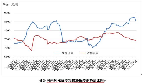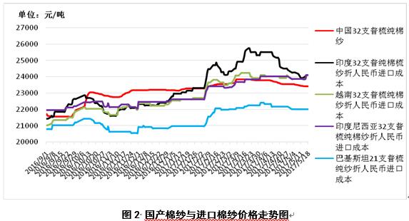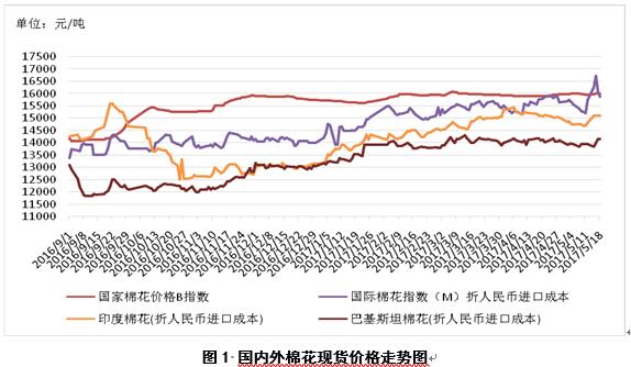 1、內(nèi)外棉花價(jià)差縮小。5月18日,國(guó)際棉花指數(shù)(M)折人民幣進(jìn)口成本15880元/噸(1%關(guān)稅,海關(guān)計(jì)征匯率,下同),低于國(guó)內(nèi)標(biāo)準(zhǔn)125元/噸,價(jià)差較上周縮小101元/噸;印度國(guó)內(nèi)S-6棉花折人民幣進(jìn)口成本15106元/噸,較國(guó)內(nèi)棉價(jià)低899元/噸,價(jià)差較上周縮小397元/噸;巴基斯坦國(guó)內(nèi)標(biāo)準(zhǔn)級(jí)棉花折人民幣進(jìn)口成本14156元/噸,較國(guó)內(nèi)棉價(jià)1849元/噸,價(jià)差較上周縮小179元/噸(圖1)。