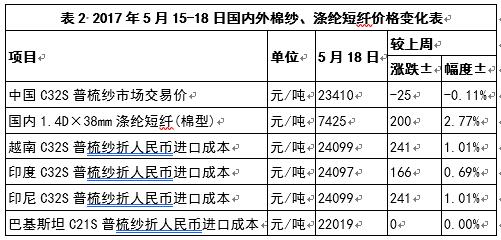 本周,國(guó)內(nèi)棉紗價(jià)格相對(duì)平穩(wěn),滌綸短纖價(jià)格止跌回升;外紗價(jià)格有所上漲(表2)。