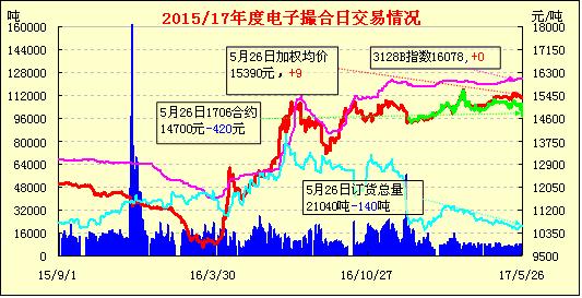 5月26日電子撮合交易成交量減少,合同均價(jià)全部收跌,活躍交投主要集中于中遠(yuǎn)期合同。今日成交積極合約主要集中于中遠(yuǎn)期合同,MA1710成交量最大,為2220噸;訂貨量減少,其中MA1708減少最多,為440噸;合同均價(jià)全部收跌。