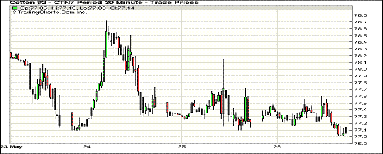 除1710合約外,周五紐約期棉普遍下跌;1707合約收于77.09美分/磅,跌7點;1712合約收于72.79美分/磅,跌43點。1707合約在59點交投區(qū)間窄幅震蕩,觸底至77.01美分,最高至77.60美分,最終小幅收跌于區(qū)間底部。1712合約買賣盤較為焦灼,因支撐動能不足,亦收跌于76點交投區(qū)間底部。外圍消息面,今年一季度美國經(jīng)濟(jì)增速為1.2%,高于此前美商務(wù)部預(yù)期的0.7%;美指有所升高,布倫特原油價格因OPEC會議無果而收低。