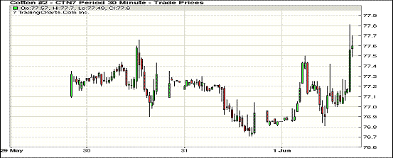 周四美元指數(shù)走低,紐約期棉止跌反彈;1707合約收于77.63美分/磅,漲65點(diǎn);1712合約收于73.50美分/磅,漲71點(diǎn)。開市后,買盤支撐1707合約突破77美分,一度至77.81美分高點(diǎn),后增長乏力,難以沖破78美分阻力線,回吐部分漲幅收于77.63美分。1712合約收于122點(diǎn)交投區(qū)間高位,最低至73美分線以下。 因本周(5月29日)美國紀(jì)念日假期,美棉出口周報延遲至本周五發(fā)布。