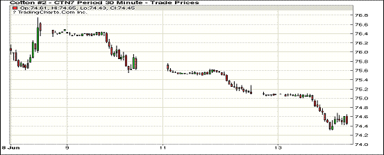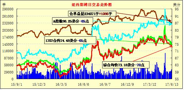 6月13日紐約期棉市場持續(xù)陰跌狀態(tài),近期7月合約結(jié)算價74.48美分/磅,跌65點;主力12月合約71.82美分,跌62點,跌至今年2月1日以來的最低水平。受三方面影響,紐約期棉市場繼續(xù)下跌,原因包括美國加息預(yù)期影響、美國PPI數(shù)據(jù)不盡人意及美棉種植進度較快,高于去年同期和近五年平均,主產(chǎn)區(qū)德州進度良好。7月合約基金繼續(xù)轉(zhuǎn)倉,7/12月合約價差呈繼續(xù)縮小趨勢。