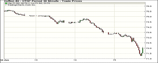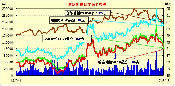 周四紐約期棉連續(xù)第五個交易日陰跌,主力12月合約跌破70美分;1707合約收于71.91美分/磅,跌159點;1712合約收于69.47美分/磅,跌148點。周四紐約期棉在美棉出口數(shù)據(jù)發(fā)布后走低,收盤前小幅回升,但當(dāng)日跌幅仍超2%,收盤價創(chuàng)近半年來新低。周四公布的美棉銷售量較前一周減少16%,周裝運量降低。此外,因加息造成的美元上漲也給棉價帶來壓力。