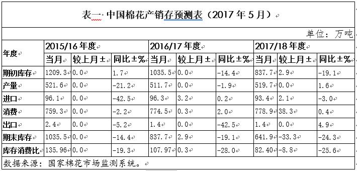 國內(nèi)棉花現(xiàn)貨市場平穩(wěn)運行,紗線產(chǎn)品保持國際競爭力,棉花需求活躍,企業(yè)進口積極性高,進口量、消費量略有調(diào)增。調(diào)整后,2016年度國內(nèi)棉花期末庫存837.7萬噸,較上月增加2.9萬噸,庫存消費比107.97,較上月提高0.3個百分點,同比下降28個百分點。2017年度棉花產(chǎn)量、消費量、進口量、期末庫存及庫存消費比也進行了相應調(diào)整。
