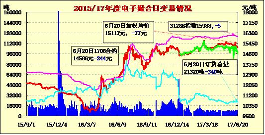 6月20日電子撮合交易成交量增加,合同均價全部收跌,活躍交投主要集中于中遠期合同。MA1711成交量最大,為4680噸;訂貨量減少,其中MA1710減少最多,為620噸;合同均價全部收跌。