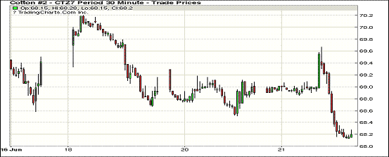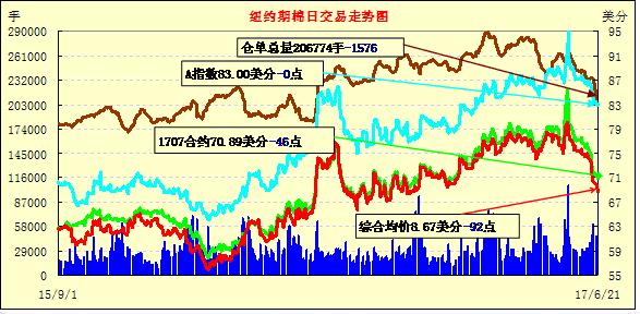 周三紐約期棉全線中等幅度下跌,主力合約在過去的9個(gè)交易日內(nèi)連續(xù)下跌,累計(jì)跌493點(diǎn);1707合約收于70.89美分/磅,跌46點(diǎn);1712合約收于68.17美分/磅,跌80點(diǎn)。周三主力合約在短暫的微幅調(diào)整后上漲,但很快遭遇阻力回落,最終收于當(dāng)日低位,最低價(jià)和收盤價(jià)均達(dá)到去年10月以來最低。本周美國南部迎來熱帶風(fēng)暴,給德克薩斯棉區(qū)帶來降雨,對(duì)目前棉花生長有利;但因西南季風(fēng)推進(jìn)遲緩,造成印度中部降雨稀少。