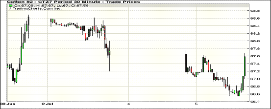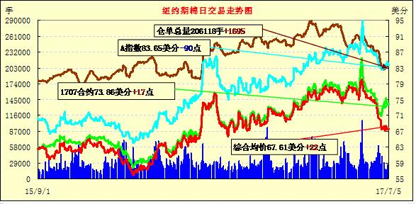 節(jié)后紐約期棉反彈幅度有限,所有合約小幅上漲;1707合約收于73.86美分/磅,漲17點;1712合約收于67.66美分/磅,漲21點。周三新花12月合約高開,但很快走弱下跌,最低價66.55美分/磅,棉花回升后合約保持在漲幅區(qū)間,收盤前達到當日交投區(qū)間頂部。至7月2日,美棉新花現蕾率45%,較上周增11%,坐果13%;15個棉區(qū)中新花不正常的比例上升到12%(10%差,2%非常差),34%一般,43%良好,11%優(yōu)秀。