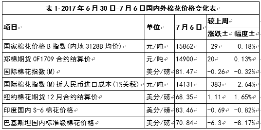 本周,國內棉花現(xiàn)貨價格較上周小幅下跌,國內外棉花期現(xiàn)貨價格低位盤整,巴基斯坦棉價大幅下跌(表1)。國內棉花增值稅率自7月份開始下調2個百分點至11%,國際棉花指數(shù)折人民幣成本價較上周下跌幅度較大。