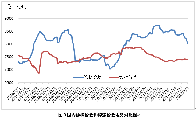 3、國內紗棉、滌棉價差縮小。本周,國內紗棉差價7393元/噸(32支普梳純棉紗價格-3128B棉花價格),較上周縮小16元/噸;滌棉差價8012元/噸(3128B棉花價格-滌綸短纖價格),較上周縮小304元/噸(見圖3)。
