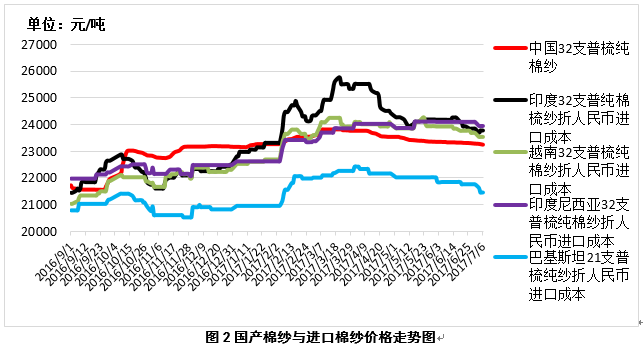 2、內外棉紗價差縮小。7月6日,越南32支普梳純棉紗23538元/噸(折人民幣進口成本,下同),較中國國內32支普梳純棉紗高283元/噸,價差較上周縮小105元/噸;印度32支普梳純棉紗23770元/噸,較中國國內32支普梳純棉紗高515元/噸,價差較上周縮小23元/噸;印尼32支普梳純棉紗23937元/噸,較中國國內32支普梳純棉紗高682元/噸,價差較上周縮小107元/噸(圖2)。