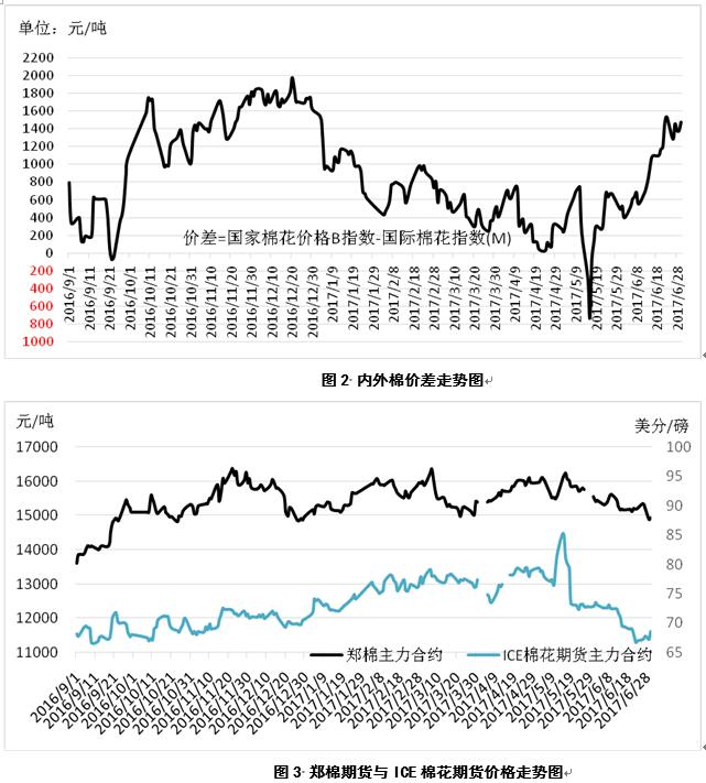 6月份以來,國內(nèi)棉花現(xiàn)貨價(jià)格保持弱勢穩(wěn)定態(tài)勢,鄭棉振蕩下跌,國外棉花期現(xiàn)貨價(jià)格大幅下跌,內(nèi)外棉價(jià)差由494元/噸擴(kuò)大至1475元/噸。(表1、圖1、圖2、圖3)。