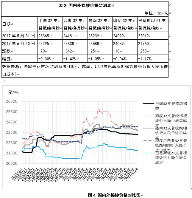 6月份以來,國內(nèi)棉紗價(jià)格繼續(xù)小幅下跌,國外棉紗價(jià)格回落,印度尼西亞棉紗價(jià)格相對穩(wěn)定??傮w上看,國外棉紗價(jià)格跌幅大于國內(nèi)棉紗,內(nèi)外棉紗價(jià)差縮小(表2、圖4)。