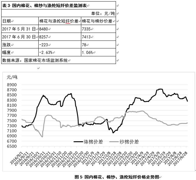 6月份以來,國內(nèi)棉花與滌綸短纖之間價(jià)差縮小,環(huán)比減幅2.63%;與棉紗之間價(jià)差有所擴(kuò)大,環(huán)比增幅1.06%(表3、圖5)。
