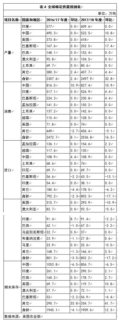 美國農(nóng)業(yè)部6月份發(fā)布的數(shù)據(jù)顯示,2017/18年度,全球棉花產(chǎn)量較上月大幅調(diào)增,消費(fèi)量調(diào)增幅度小于產(chǎn)量,貿(mào)易量較上月調(diào)減,期末庫存調(diào)增;中國以外地區(qū)棉花產(chǎn)大于需266萬噸,較上月增加16萬噸,較2016/17年度擴(kuò)大110萬噸(表4)。