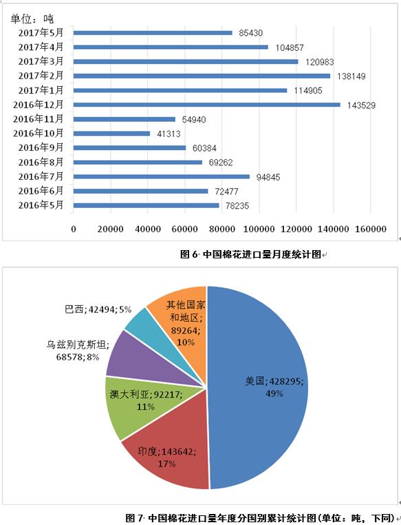 2017年5月,中國進(jìn)口棉花8.5萬噸,較4月份減少1.9萬噸(圖6);2016年9月-2017年5月,中國累計(jì)進(jìn)口棉花86.4萬噸,同比增加14.2萬噸,主要進(jìn)口來源為美國、印度、澳大利亞、烏茲別克斯坦和巴西,占比分別為49%、17%、11%、8%和5%(圖7)。
