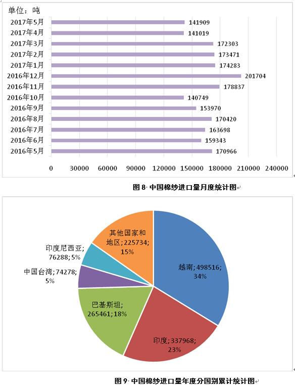 2017年5月,中國進(jìn)口棉紗14.2萬噸,較4月份增加890噸(圖8);2016年9月-2017年5月,中國累計(jì)進(jìn)口棉紗147.8萬噸,同比減少6.3萬噸,主要進(jìn)口來源為越南、印度、巴基斯坦、中國臺灣和印度尼西亞,占比分別為34%、23%、18%、5%和5%(圖9)。