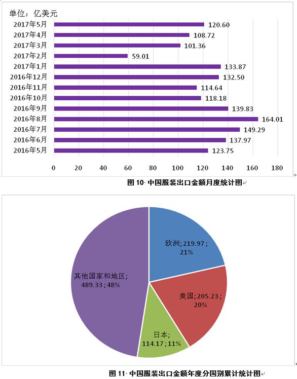 2017年5月,中國服裝出口金額120.60億美元,較4月份增加11.88億美元(圖10);2016年9月-2017年5月,中國累計(jì)服裝出口金額1028.7億美元,同比減少86.6億美元,主要出口市場為歐洲(只包括歐盟及英國,下同)、美國和日本,占比分別為21%、20%和11%(圖11)。