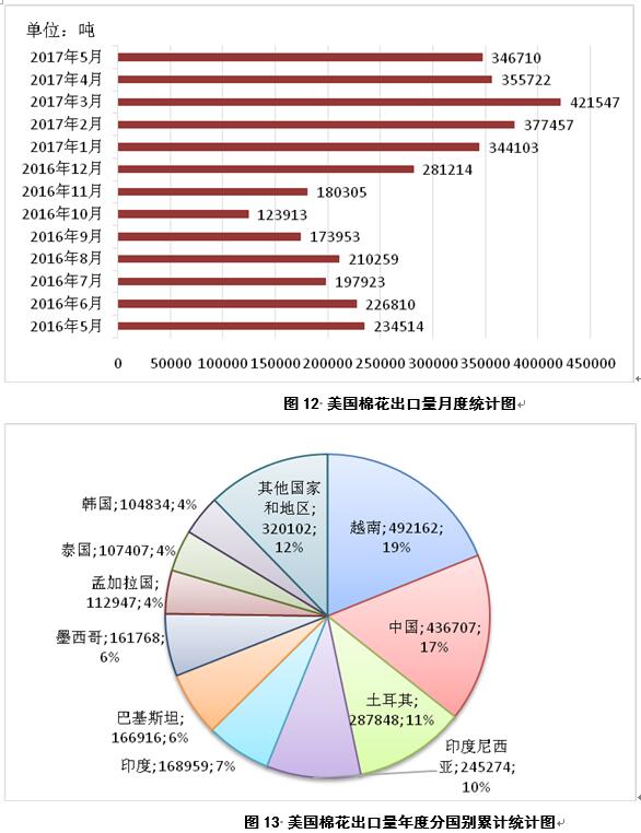 2017年5月,美國出口棉花34.7萬噸,較4月份減少0.9萬噸(圖12);2016年9月-2017年5月,美國累計(jì)出口棉花260.5萬噸,同比減少113.5萬噸,出口目的地主要為越南、中國、土耳其、印度尼西亞、印度、巴基斯坦、墨西哥和孟加拉國、泰國、韓國,占比分別為19%、17%、11%、10%、7%、6%、6%和4%(圖13)。