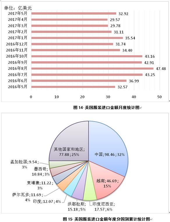 2017年5月,美國服裝進(jìn)口金額32.92億美元,較4月份增加3.36億美元(圖14);2016年9月-2017年5月,美國累計(jì)服裝進(jìn)口金額311.14億美元,同比減少11.68億美元,主要進(jìn)口來源為中國、越南、印度尼西亞、洪都拉斯、印度、薩爾瓦多、柬埔寨、墨西哥和孟加拉國,占比分別為32%、15%、6%、5%、4%、4%、4%、3%和3%(圖15)。