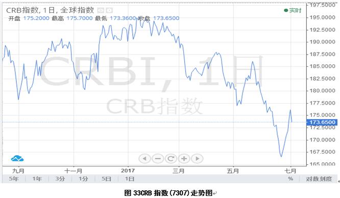 2017年6月31日,CRB指數(shù)(7307)收盤價(jià)174.78,環(huán)比下跌2.78%(圖33)。