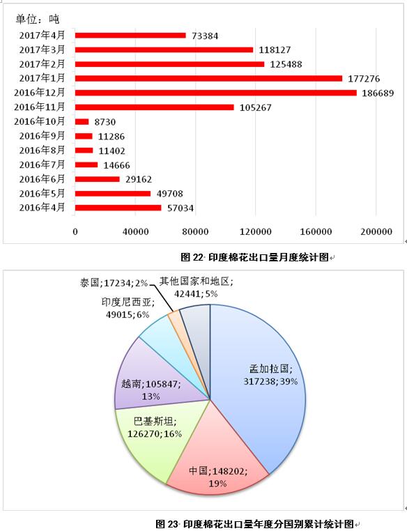 2017年4月,印度出口棉花7.3萬噸,較3月份減少4.5萬噸(圖22);2016年9月-2017年4月,印度累計(jì)出口棉花80.6萬噸,同比減少31萬噸,主要出口目的地為孟加拉國、中國、巴基斯坦、越南、印度尼西亞和泰國,占比分別為39%、19%、16%、13%、6%和2%(圖23)。
