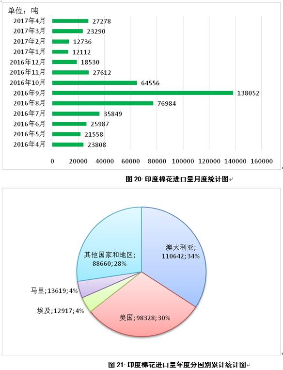 2017年4月,印度進(jìn)口棉花2.7萬噸,較3月份增加0.4萬噸(圖20);2016年9月-2017年4月,印度累計(jì)進(jìn)口棉花32.4萬噸,同比增加20.4萬噸,主要進(jìn)口來源為澳大利亞、美國、埃及和馬里,占比分別為34%、30%、4%和4%(圖21)。