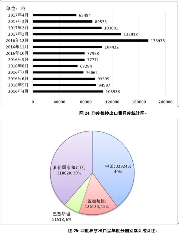 2017年4月,印度出口棉紗6.5萬噸,較3月份減少2.4萬噸(圖24);2016年9月-2017年4月,印度累計(jì)出口棉紗82.6萬噸,同比減少4.2萬噸,主要出口目的地為中國、孟加拉國和巴基斯坦,占比分別為40%、15%和6%(圖25)。
