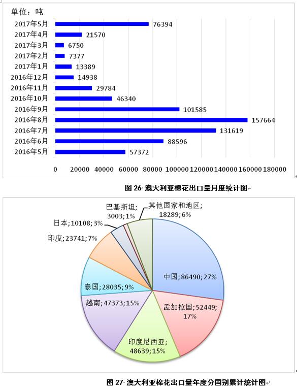 2017年5月,澳大利亞出口棉花7.6萬噸,較4月份增加5.5萬噸(圖26);2016年9月-2017年5月,澳大利亞累計(jì)出口棉花31.8萬噸,同比減少0.97萬噸,主要出口目的地為中國、孟加拉國、印度尼西亞、越南、泰國、印度、日本、巴基斯坦,占比分別為27%、17%、15%、15%、9%、7%、3%、1%(圖27)。