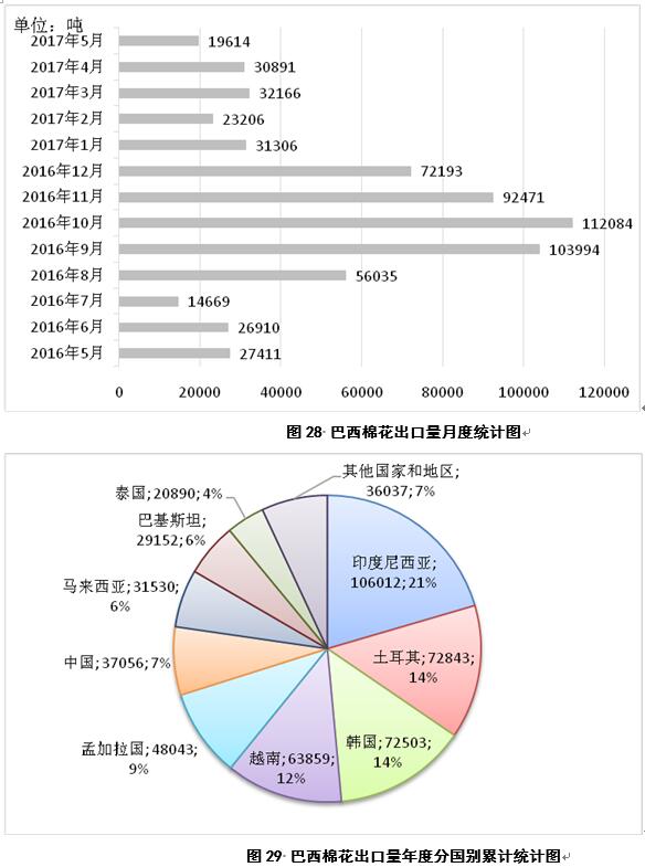 2017年5月,巴西出口棉花1.9萬噸,較4月份減少1.1萬噸(圖28);2016年9月-2017年5月,巴西累計(jì)出口棉花51.8萬噸,同比減少33萬噸,主要出口目的地為印度尼西亞、土耳其、韓國、越南、孟加拉國、中國、馬來西亞、巴基斯坦和泰國,占比分別為21%、14%、14%、12%、9%、7%、6%、6%和4%(圖29)。