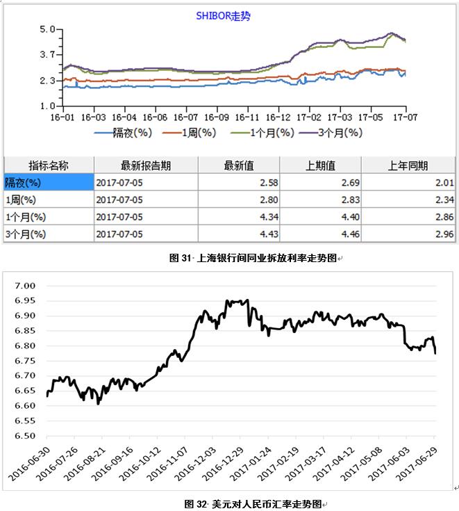 7月5日,上海銀行間同業(yè)隔夜拆放利率2.58,環(huán)比下跌0.11,同比上漲0.57(圖31);美元對人民幣匯率中間價(jià)6.7922,環(huán)比下跌0.02%,同比上漲2%(圖32)。