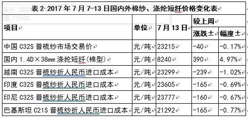 本周,國內(nèi)棉紗價格弱勢不改,滌綸短纖價格大幅上漲;外紗價格繼續(xù)回落(表2)。