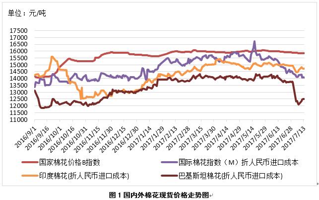 1、內(nèi)外棉價差略有擴(kuò)大,中國與印巴棉價差進(jìn)一步縮小。7月13日,國際棉花指數(shù)(M)折人民幣進(jìn)口成本14065元/噸(1%關(guān)稅,海關(guān)計征匯率,下同),低于國內(nèi)標(biāo)準(zhǔn)1771元/噸,價差較上周擴(kuò)大40元/噸;印度國內(nèi)S-6棉花折人民幣進(jìn)口成本14733元/噸,較國內(nèi)棉價低1103元/噸,價差較上周縮小292元/噸;巴基斯坦國內(nèi)標(biāo)準(zhǔn)級棉花折人民幣進(jìn)口成本12481元/噸,較國內(nèi)棉價低3355元/噸,價差較上周縮小167元/噸(圖1)。