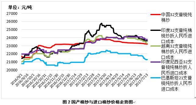 2、內(nèi)外棉紗價差再次縮小。7月13日,越南32支普梳純棉紗23299元/噸(折人民幣進(jìn)口成本,下同),較中國國內(nèi)32支普梳純棉紗高84元/噸,價差較上周縮小199元/噸;印度32支普梳純棉紗23605元/噸,較中國國內(nèi)32支普梳純棉紗高390元/噸,價差較上周縮小125元/噸;印尼32支普梳純棉紗23777元/噸,較中國國內(nèi)32支普梳純棉紗高562元/噸,價差較上周縮小120元/噸(圖2)。