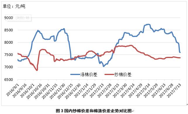 儲備棉競拍成交率上升,現(xiàn)貨銷售力度加大。7月7-13日,儲備棉輪出掛牌量14.97萬噸,實(shí)際成交量10.25萬噸,成交率68.49%,較上周上升14.91個百分點(diǎn),成交均價14692元/噸,較上周下跌143元/噸。其中,新疆儲備棉熱度不減,最高加價2860元/噸左右;地產(chǎn)儲備棉成交5.09萬噸,較上周增加2.44萬噸。近期,國內(nèi)各地棉花陸續(xù)進(jìn)入花鈴期,總體來看長勢略優(yōu)于去年。隨著新棉上市的逐步臨近,經(jīng)營企業(yè)紛紛加大皮棉銷售力度。下游純棉紗價格繼續(xù)走弱,高支紗相對較大。受滌綸短纖價格上漲影響,純滌紗、滌棉紗價格均小幅上漲。