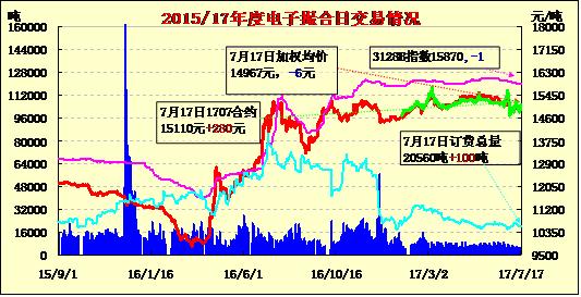 7月17日電子撮合交易成交量減少,合同均價(jià)多數(shù)收漲,活躍交投主要集中于中遠(yuǎn)期合同。MA1712成交量最大,為3480噸;訂貨量增加,其中MA1712增加最多,為480噸;合同均價(jià)多數(shù)收漲。