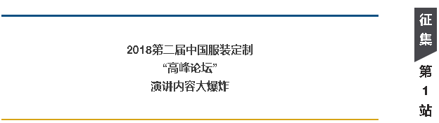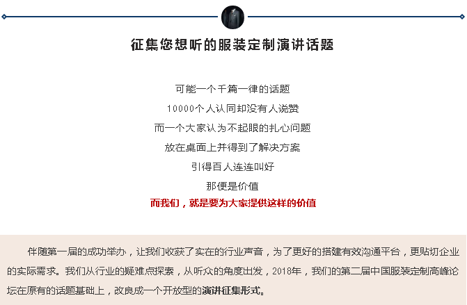 第一屆論壇的結(jié)束,我們通過電話調(diào)研得知不少聽眾提出了寶貴的idea,同時對第二屆論壇表現(xiàn)出蠻高的期許,結(jié)合當(dāng)下服裝定制的熱點(diǎn)話題,我們整理了部分演講話題,其中呼聲最熱當(dāng)屬:“服裝定制行業(yè)的標(biāo)準(zhǔn)規(guī)范”