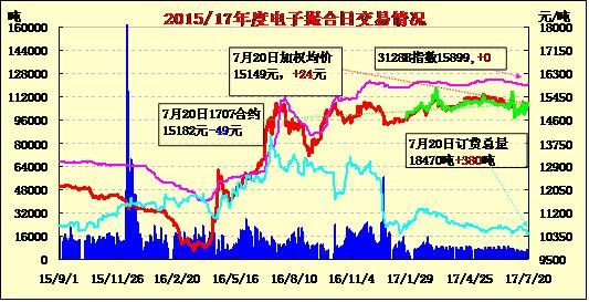 7月20日電子撮合交易成交量減少,合同均價(jià)多數(shù)收漲,活躍交投主要集中于中遠(yuǎn)期合同,MA1711成交量最大,為2000噸;訂貨量增加,其中MA1712減少最多,為560噸;合同均價(jià)多數(shù)收漲。