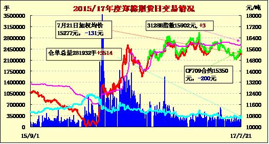7月21日隔夜鄭棉CF1801盤整,今日盤中繼續(xù)震蕩,午后在利空消息的打壓下迅速下滑,隨后區(qū)間盤整,尾盤增倉收低,日線形成陰線。日內(nèi)成交量放大,持倉量近減遠增?;久媲闆r:棉花現(xiàn)貨市場調(diào)整,價格基本維持,且呈現(xiàn)兩極分化趨勢,高品質(zhì)棉花價格堅挺,河南等地兵團雙28級高品質(zhì)手摘報價在16800-17000元/噸公定,實際商談優(yōu)惠。長絨棉市場弱勢調(diào)整,報價局部下調(diào),河南地區(qū)137級提貨報價在22200元/噸毛重,237級在21300元/噸,較上周下跌200-300元/噸,多為清理庫存回籠資金,為新年度做準備。但亦有棉商堅挺報價。