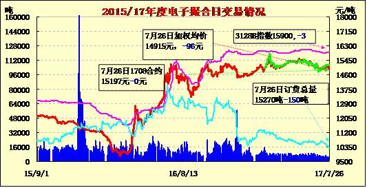 7月26日電子撮合交易成交量減少,合同均價全部收跌,活躍交投主要集中于中遠(yuǎn)期合同。MA1801成交量最大,為2140噸;訂貨量減少,其中MA1711減少最多,為600噸;合同均價全部收跌。