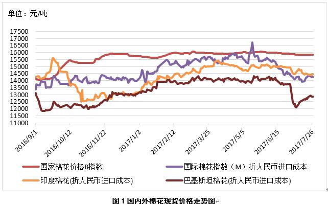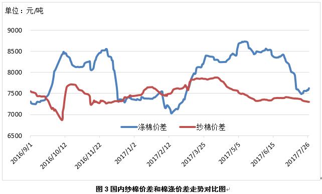 1、內(nèi)外棉價(jià)差整體略有擴(kuò)大,中國(guó)與印巴棉價(jià)差縮小。7月27日,國(guó)際棉花指數(shù)(M)折人民幣進(jìn)口成本14258元/噸(1%關(guān)稅,海關(guān)計(jì)征匯率,下同),低于國(guó)內(nèi)標(biāo)準(zhǔn)1594元/噸,價(jià)差較上周擴(kuò)大82元/噸;印度國(guó)內(nèi)S-6棉花折人民幣進(jìn)口成本14462元/噸,較國(guó)內(nèi)棉價(jià)低1390元/噸,價(jià)差較上周縮小14元/噸;巴基斯坦國(guó)內(nèi)標(biāo)準(zhǔn)級(jí)棉花折人民幣進(jìn)口成本12859元/噸,較國(guó)內(nèi)棉價(jià)低2993元/噸,價(jià)差較上周縮小186元/噸(圖1)。