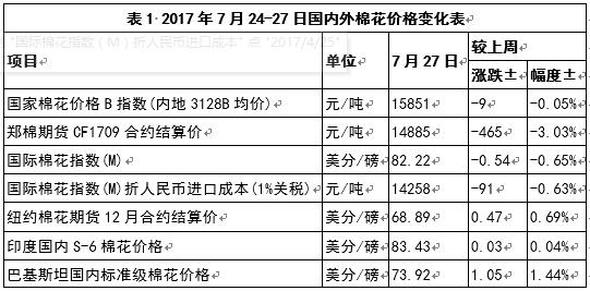 本周,國(guó)內(nèi)外棉花現(xiàn)貨價(jià)格略跌,巴基斯坦棉價(jià)上漲;ICE期棉維持盤整,鄭棉期貨大幅下跌(表1)。