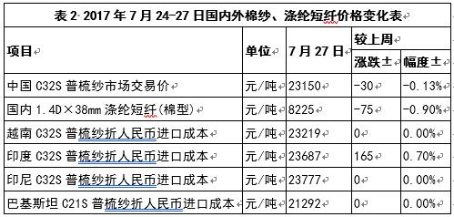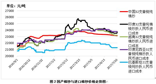 2、內(nèi)外棉紗價(jià)差擴(kuò)大。7月27日,越南32支普梳純棉紗23219元/噸(折人民幣進(jìn)口成本,下同),較中國(guó)國(guó)內(nèi)32支普梳純棉紗高69元/噸,價(jià)差較上周擴(kuò)大30元/噸;印度32支普梳純棉紗23687元/噸,較中國(guó)國(guó)內(nèi)32支普梳純棉紗高537元/噸,價(jià)差較上周擴(kuò)大195元/噸;印尼32支普梳純棉紗23777元/噸,較中國(guó)國(guó)內(nèi)32支普梳純棉紗高627元/噸,價(jià)差較上周擴(kuò)大30元/噸(圖2)。