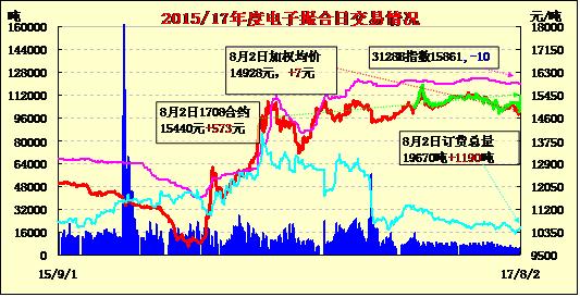 8月2日電子撮合交易成交量增加,合同均價(jià)多數(shù)收漲,活躍交投主要集中于中遠(yuǎn)期合同,MA1712成交量最大,為3450噸;訂貨量增加,其中MA1801增加最多,為460噸;合同均價(jià)全多數(shù)收漲。