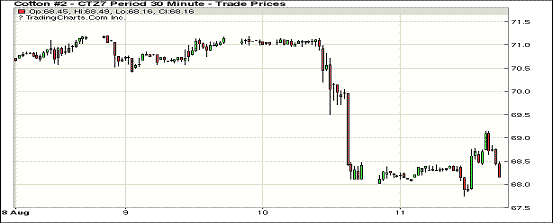 11日紐約期棉市場在經(jīng)歷前一日大跌后修整,1712合約收768.25美分/磅,漲14點;1803合約收于68.05美分/磅,漲22點。12/3月合約價差20點。當(dāng)日12月合約上半場交易在68-68.5美分之間窄幅波動,盤中跌破68美分,最低至67.76美分。但市場短暫低位盤整后獲得支撐,從低點反彈回歸68美分以上,終以小漲收盤。分析師指出,市場從70美分以上回落到68美分一線,帶動現(xiàn)貨市場詢盤和成交增加。