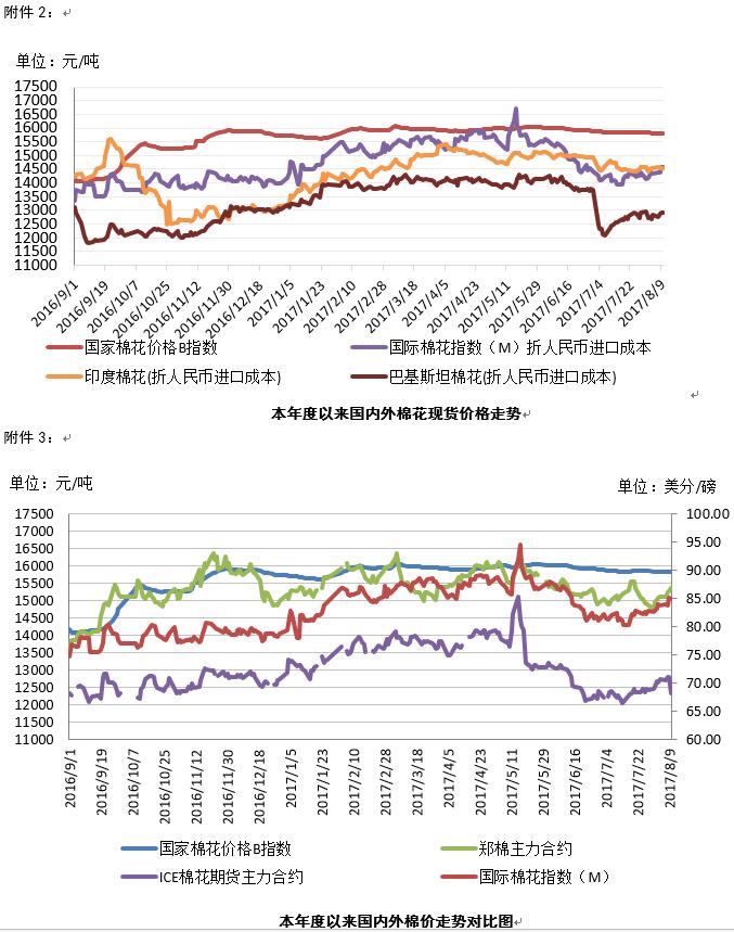 本周,美國農(nóng)業(yè)部發(fā)布8月全球棉花產(chǎn)需預(yù)測(cè),大幅上調(diào)2017/18年度產(chǎn)量和期末庫存,ICE期貨價(jià)格出現(xiàn)大幅下跌,國際棉花現(xiàn)貨價(jià)格隨之下調(diào),8月11日,紐約棉花期貨12月合約結(jié)算價(jià)68.25美分/磅,較上周下跌2.37美分/磅,跌幅3.36%,代表進(jìn)口棉中國主港到岸均價(jià)的國際棉花指數(shù)(M)按1%關(guān)稅計(jì)算,折人民幣進(jìn)口成本13582元/噸,較上周下降773元/噸,跌幅5.39%。內(nèi)外棉價(jià)差擴(kuò)大至2242元/噸。